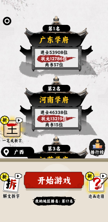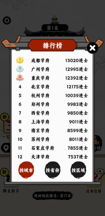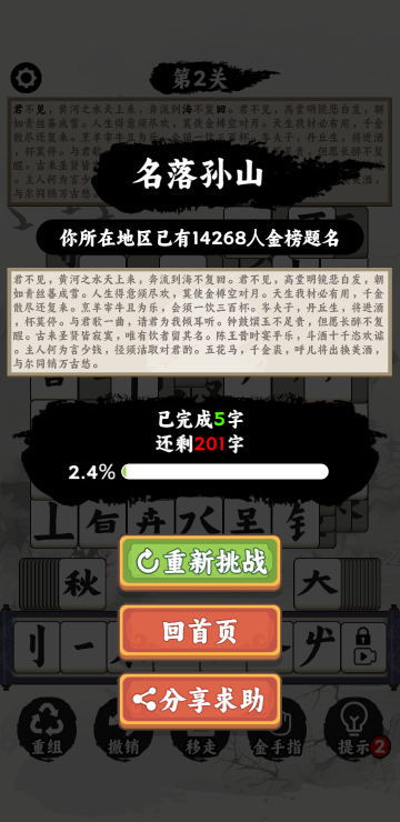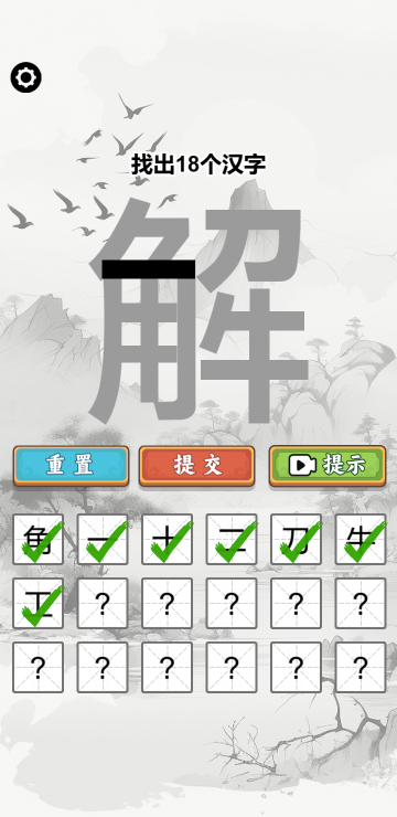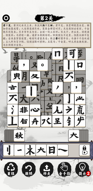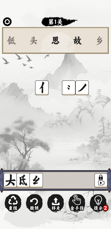此游戏为休闲益智类游戏,这是一个中文汉字的游戏,里面有诗句、成语,短句,笔画等等,你需要根据给出的卡片来组成成一个汉字,才能正确填写到上方的内容,当所有内容集齐就算闯关成功,还有其他玩法,必须拆解汉字,组合汉字等等。