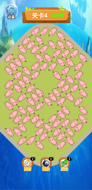 此游戏为休闲游戏,一大群小猪被困荒岛等你拯救,你需要按照小猪的朝向,点击小猪后如果没有阻碍就可以拯救它,有阻碍小猪是出不去的哦,还支持自定义关卡内容来实现自己想玩的关卡数据。