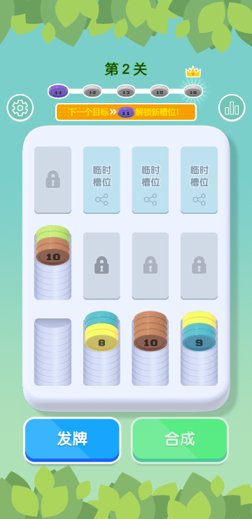 此游戏为休闲类游戏,游戏内容很简单。每一关只需要达成特定目标即可进行下一关,比如第一关的目前是解锁数字10,通过发牌和合成功能,只要合成到10即为过关,以此类推,非常好玩的解压游戏。