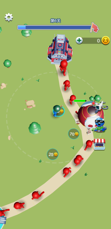 此游戏为休闲塔防类游戏,游戏中你需要防守我方阵地,可以通过移动改变自己的位置,在初始位置不远处有个标记,进入标记待进度加载完成即为开始战斗敌人即将进攻,地上会有金币符号的小圈,进入即可扣除金币建造炮台,再次进入可以升级炮台,后面关卡还会多个方向同时出现敌人,一定要先建造好炮台再开始战斗。