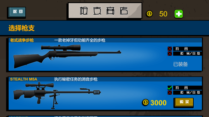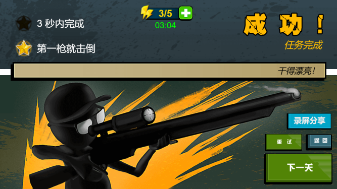 此游戏为休闲射击类游戏,每关都有特定任务,你需要击杀任务目标才算通关,一定要一击即中,否则任务就算失败需要重新开始,如果武器不顺手还可以从商店购买更好的武器,这样可以更轻松完成任务。