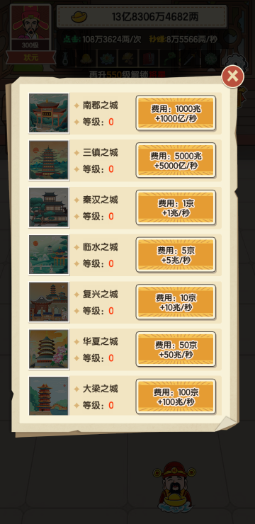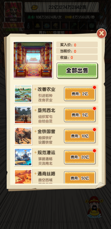 此游戏为休闲养成类游戏,开局的你是乞丐模样,通过不断赚钱升级成为皇帝不是梦,游戏内赚钱的方法很多,可以通过选妃属性加成收益,通过升级解锁技能置办产业和征收他国供奉,还可以通过各种小游戏来获取高额收益,快来体验吧。