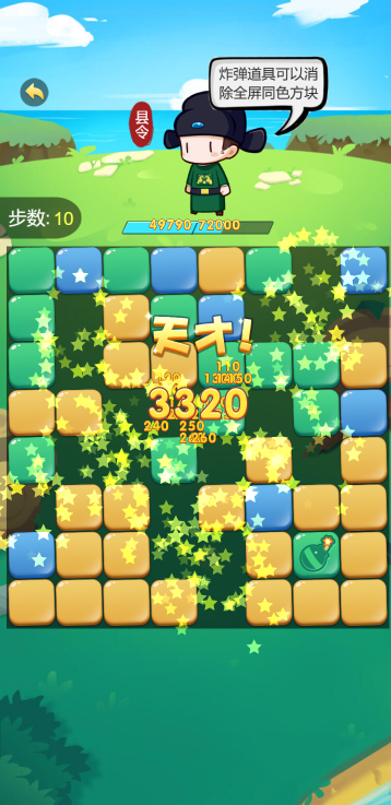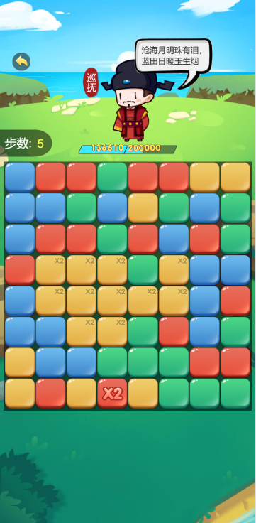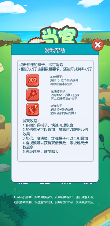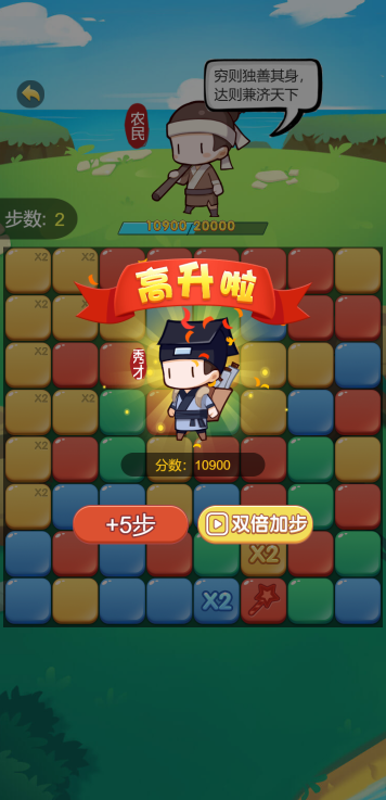 在有限的步数内,通过消除获取积分来提升当官进度,每提升一个官级可以观看视频使步数加倍,从而可以达到更高的官衔,相当皇帝不是梦,只要你够强!