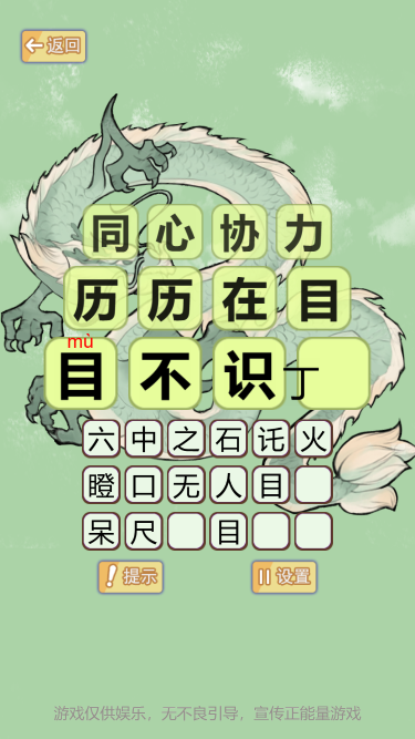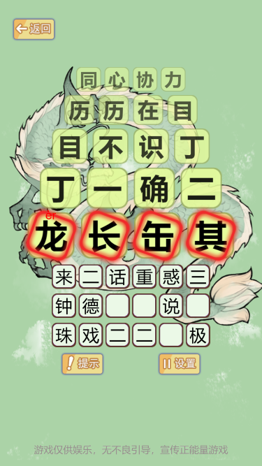 根据给出的若干汉字来接龙成语,接龙的成语首汉字需要与前一个成语的最后一个汉字同音或者相同才算正确。