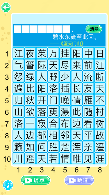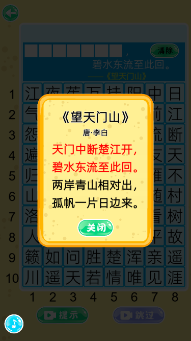 此游戏为休闲类游戏,简单来说就是根据古诗的上一句或者下一句来填出另外一句,完整且没有错误即可过关,不要被汉字看花了眼哦。