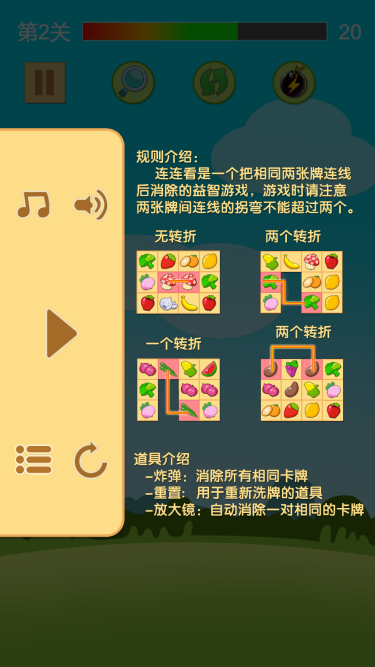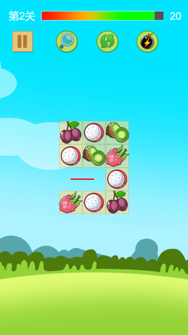 此游戏为休闲消除类游戏,同类水果没有阻隔的情况下即可消除,要完成当前关卡所有水果的消除才算胜利。