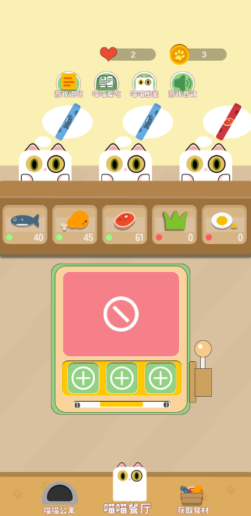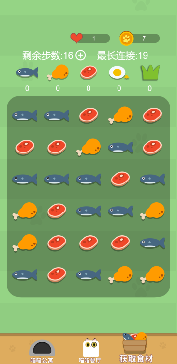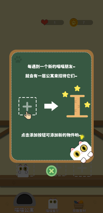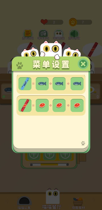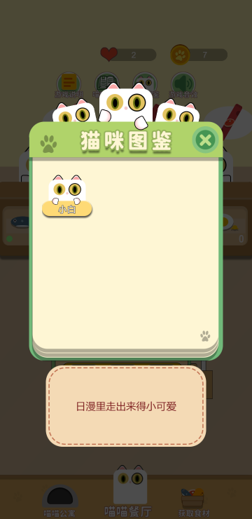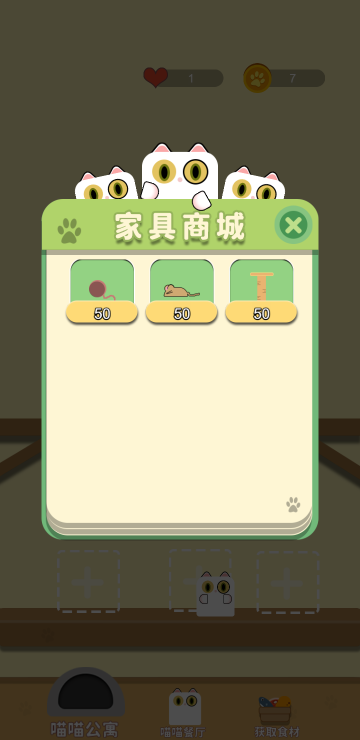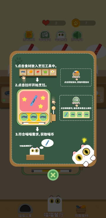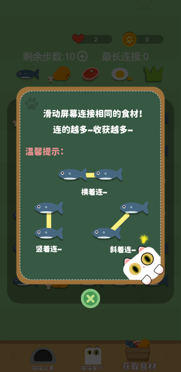 此游戏为休闲类游戏,游戏内可以养喵咪,通过消除类小游戏可以获取食材,加工食材就可以给喵咪做出食物从而获得货币,用来购买商城内的各种物品,游戏很有意思哦。