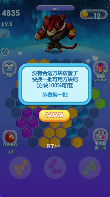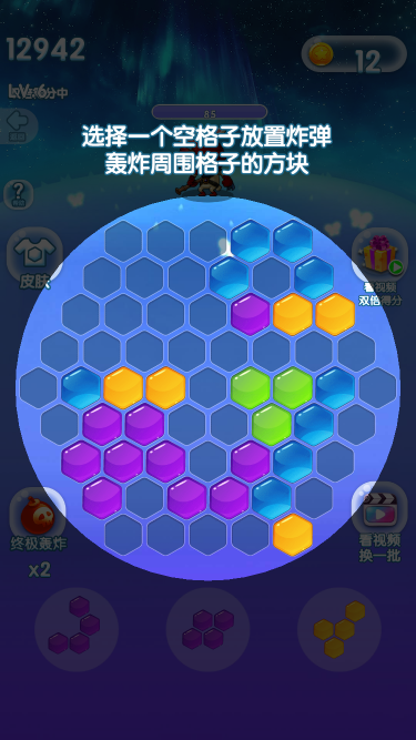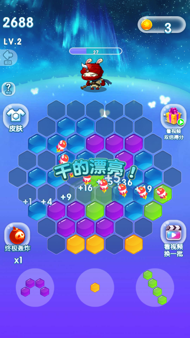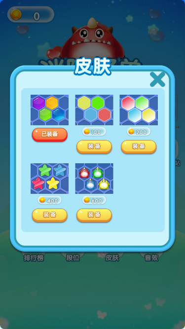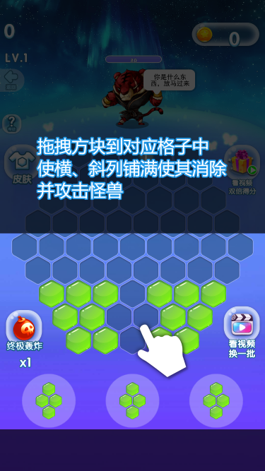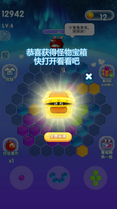 此游戏为休闲类游戏,一个六边形消除游戏,可以通过消除来击败怪兽获取奖励,道具可以有效提升消除的速度,还有多款皮肤可以选择哦。