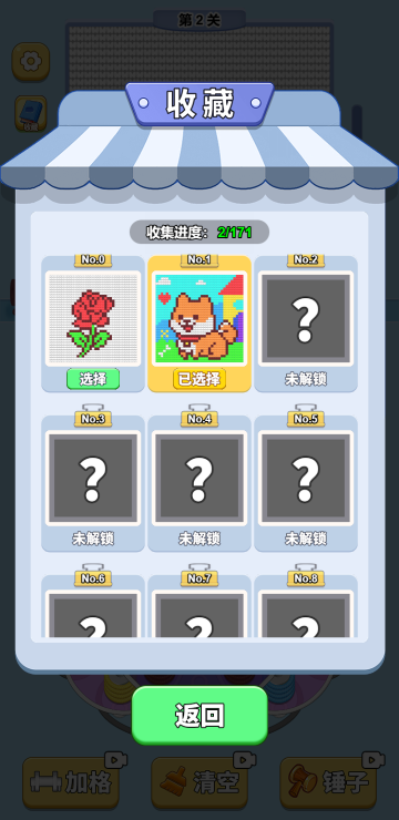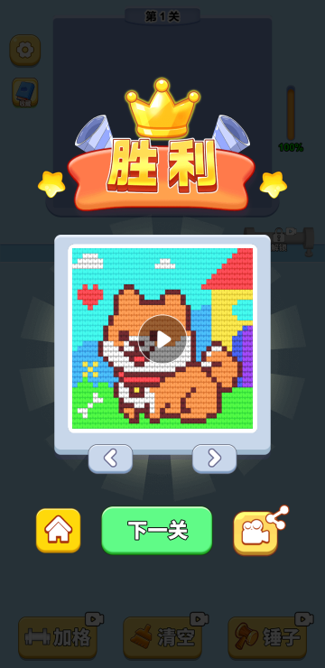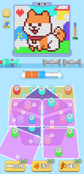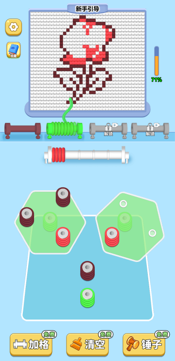 玩法类似过不去的钉子,游戏内容为每三根相同颜色的毛线消除,就可以在画板上面勾画一笔,当所有毛线全部消除完就可以画出一幅完整的图画,如果游戏中槽位不够就可以观看视频来增加,赶快来收集世界名画吧!
