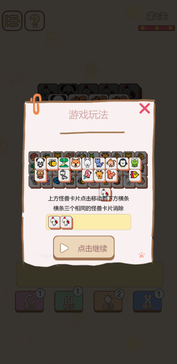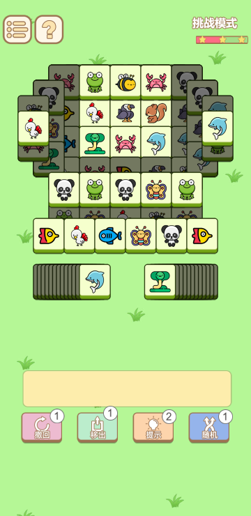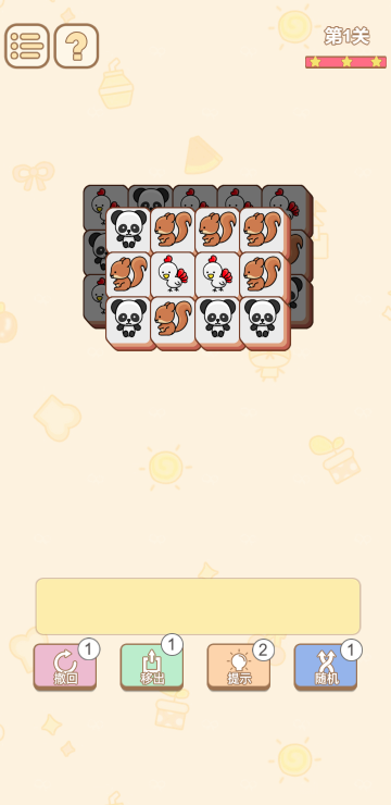 游戏内容为三种一样的动物同在状态栏即可消除,当状态栏满且没有可以消除的情况即为失败,游戏分为闯关模式和挑战模式,合理使用道具游戏更加愉快。