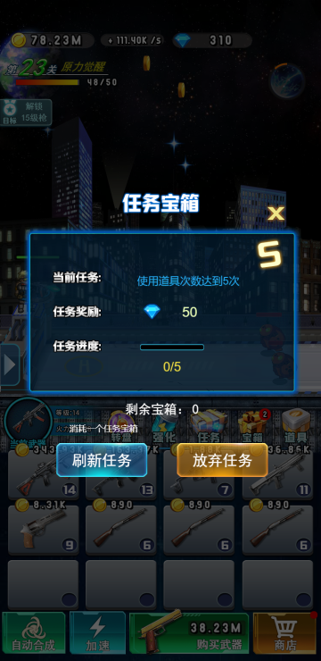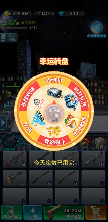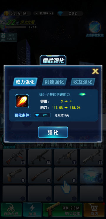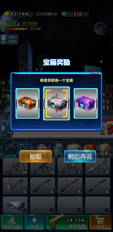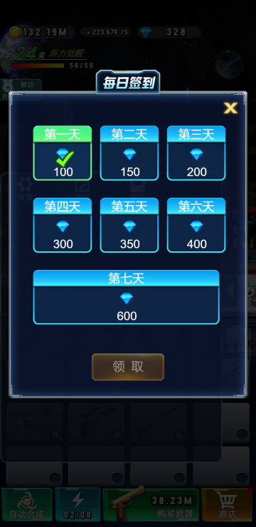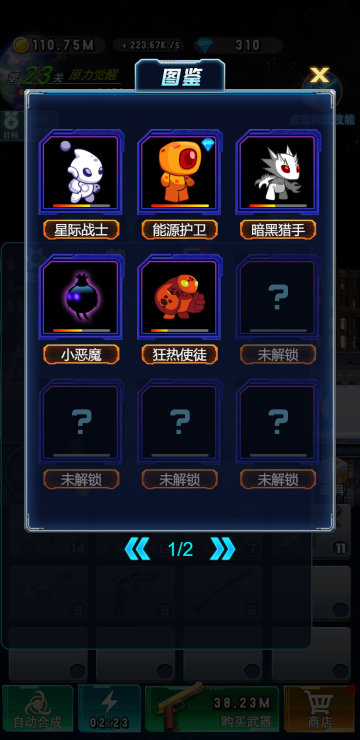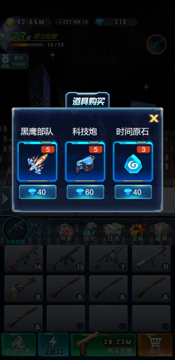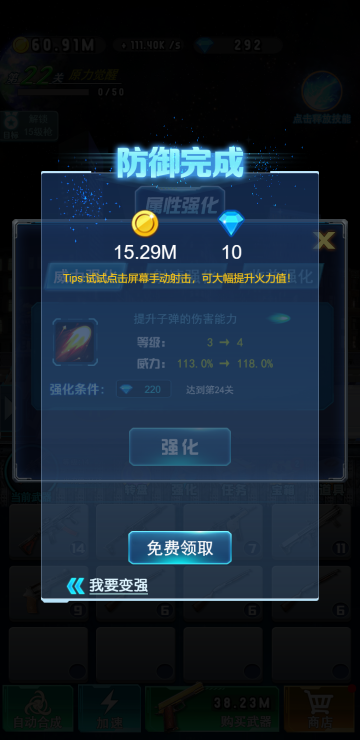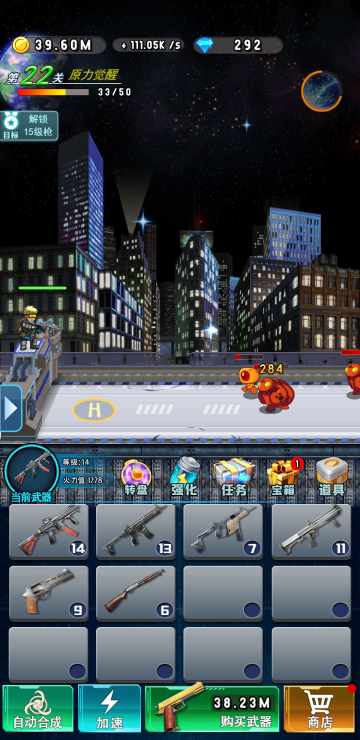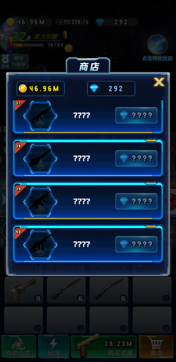 此游戏为休闲合成类小游戏,游戏内你可以通过不断击杀怪兽来获取金币,用来购买枪支,而低级枪支可以通过合成为高级枪支,等级越高威力就越大,共有40种枪支可以解锁,记得使用自动合成功能哦,游戏内还可以通过各种方式来获取钻石和解锁道具,快快体验吧。