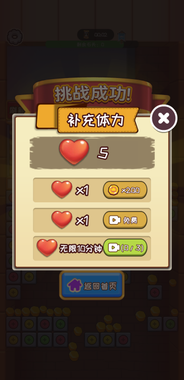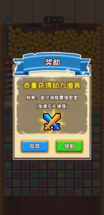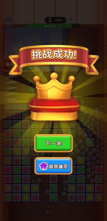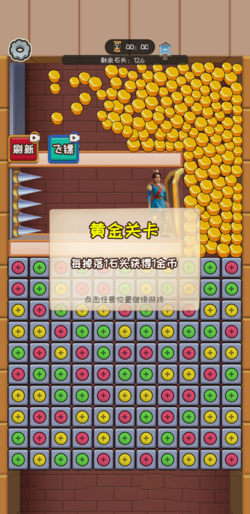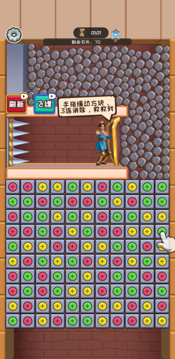 此游戏为休闲消除类游戏,密室中会有大量的石头或者金币,在通过消除打开通道之前,这些道具会不断挤压角色的盾牌,而在角色背后却是陷阱,我们要做的就是消除打开一条宽敞的道路,在时间倒计时结束之前解救人物即为胜利,金币关卡每掉落一个金币就可以增加一个金币哦。