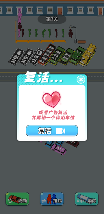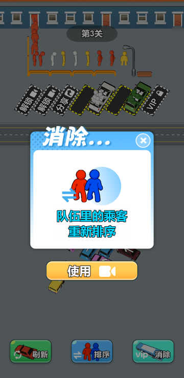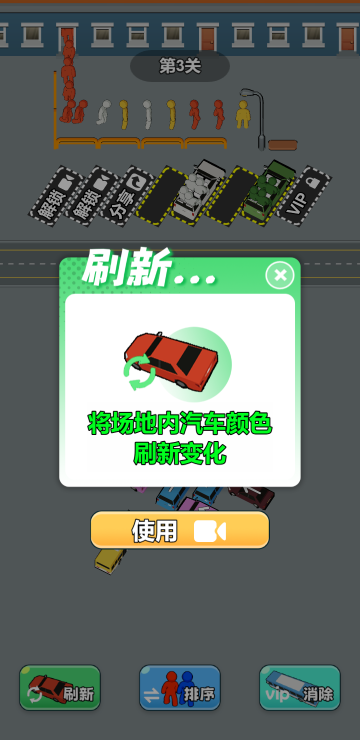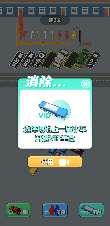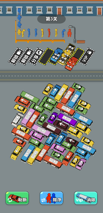 此游戏为休闲益智类游戏,游戏中你需要为排队的客人准备对应颜色的车辆,然而停车位有限,你需要根据客人的数量来选择合适的车辆,只有箭头方向无障碍的车辆才能开出哦,添加停车位有时也是很有必要的。