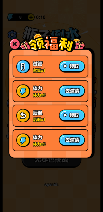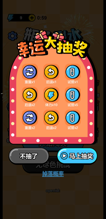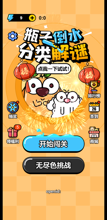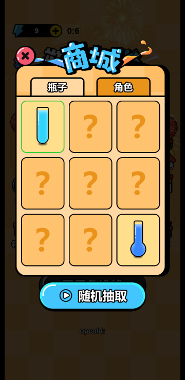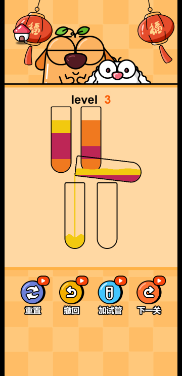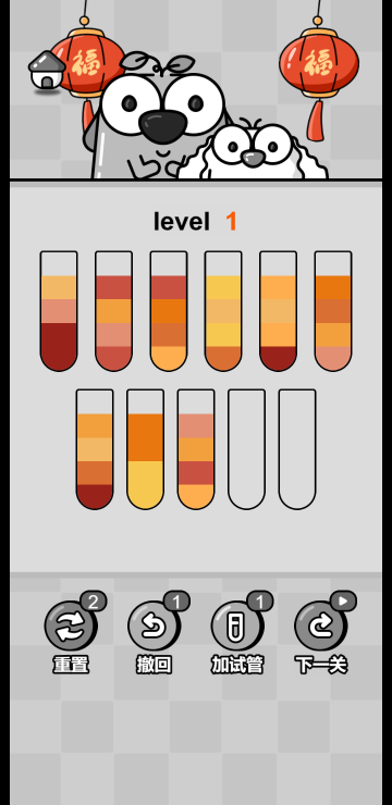 此游戏为休闲益智游戏,你需要根据已有的道具来区分不同颜色的液体,最终保证每个容器内只有一种单独颜色的液体即为胜利,还多多款瓶子和角色的皮肤等你选择,游戏也有闯关模式和无尽模式等你挑战。