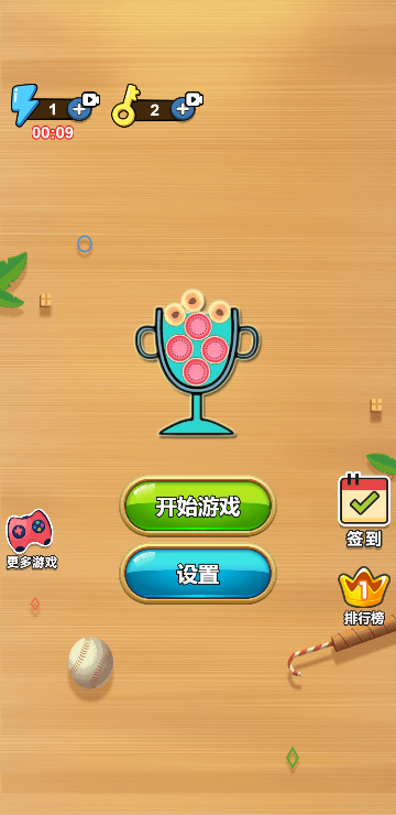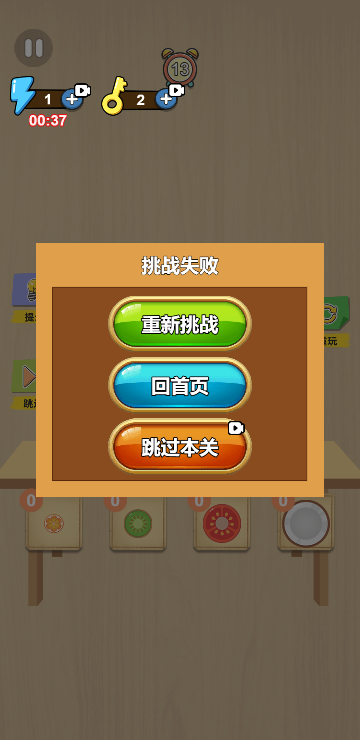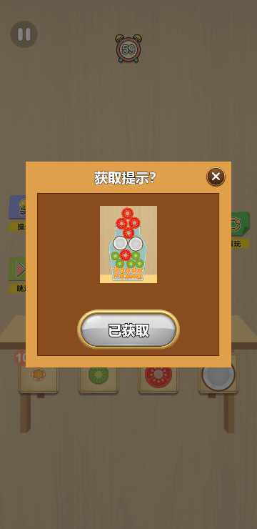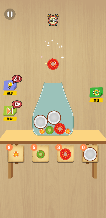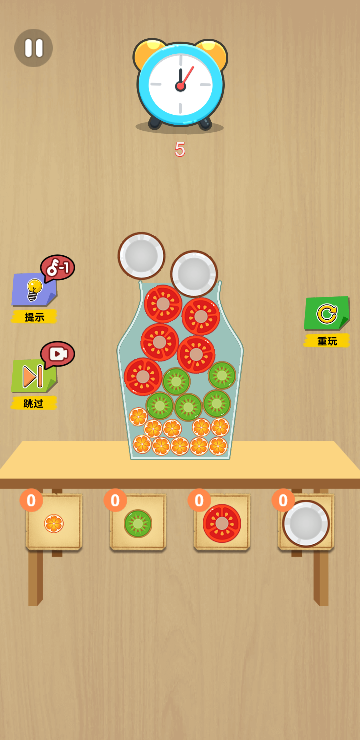 此游戏为休闲益智游戏,根据下方给出的水果数量以合适的方法摆放进容器内,并且保证不会溢出容器,即为挑战成功,水果的摆放顺序和数量也很重要哦。