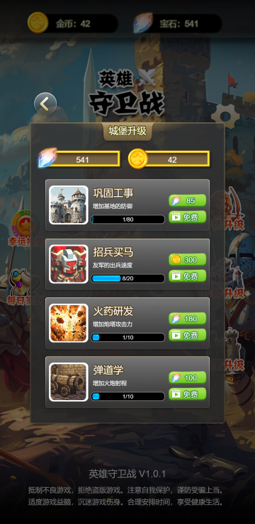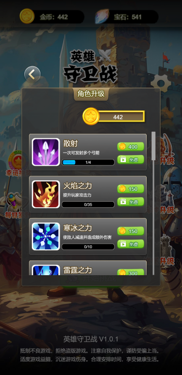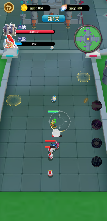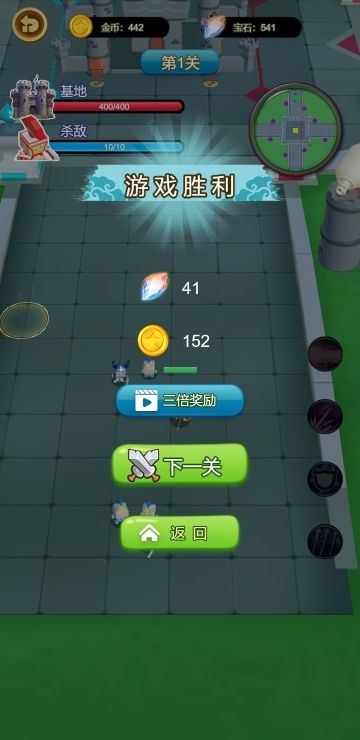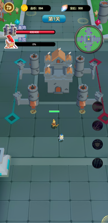 此游戏为休闲战斗类游戏,作为主角你需要击败所有敌人,每一关都有固定数量的敌人,全部消灭才能通关,可以通过移动来改变角色位置,在防御塔的黄色圈内就可以升级防御塔,等级越高的防御塔攻击越高,还可以通过升级来提升乙方的整体实力。